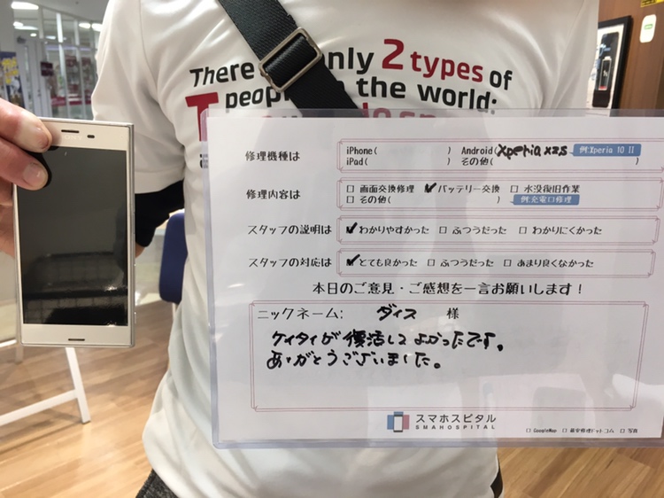 スマホスピタル厚木ガーデンシティ 【XperiaXZs】電源が入らずバッテリーによる交換修理 『ダイス様』よりのコメントを頂きました。