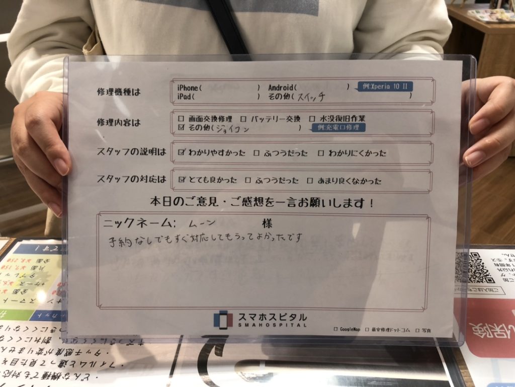 スマホスピタル厚木ガーデンシティ 【Switch】ジョイコンスティック故障による交換修理 『ムーン様』よりのコメントを頂きました。