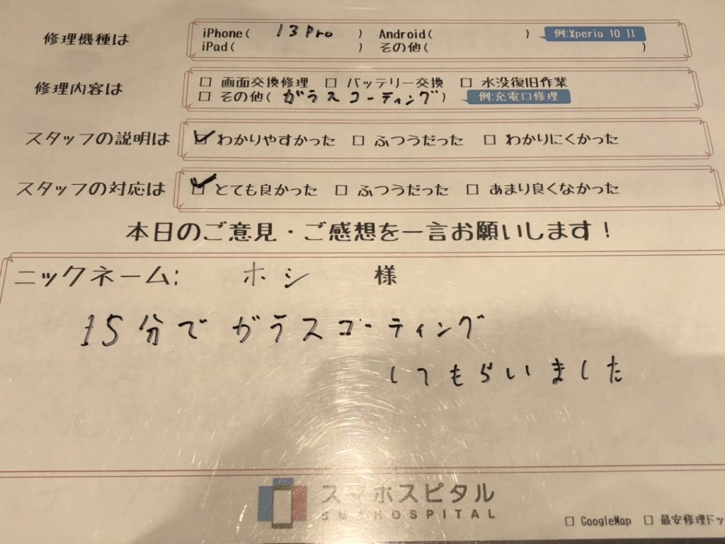 スマホスピタル厚木ガーデンシティ 【iPhone13Pro】ガラスコーティング施工 『ホシ様』よりのコメントを頂きました。