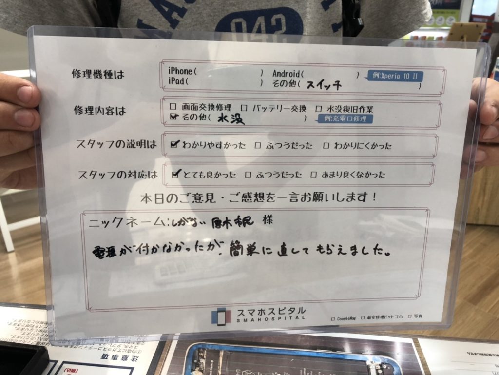 スマホスピタル厚木ガーデンシティ 【Switch】水没復旧による修理 『しかない厚木市民様』よりのコメントを頂きました。