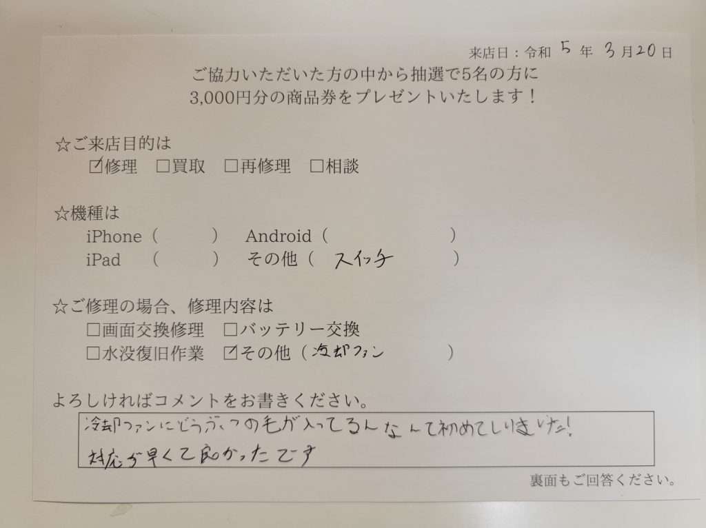 スマホスピタル厚木ガーデンシティ Switchの修理でご来店頂いたお客様からコメントを頂きました!