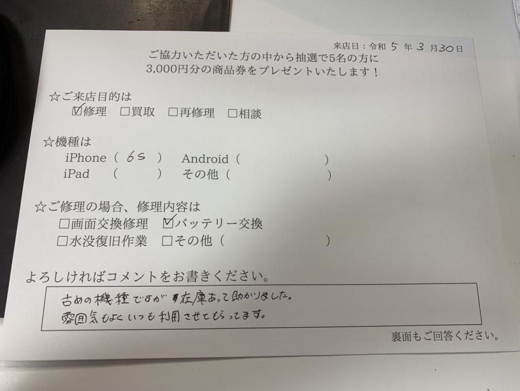 スマホスピタル厚木ガーデンシティ iPhone6s バッテリー交換修理を行いました。