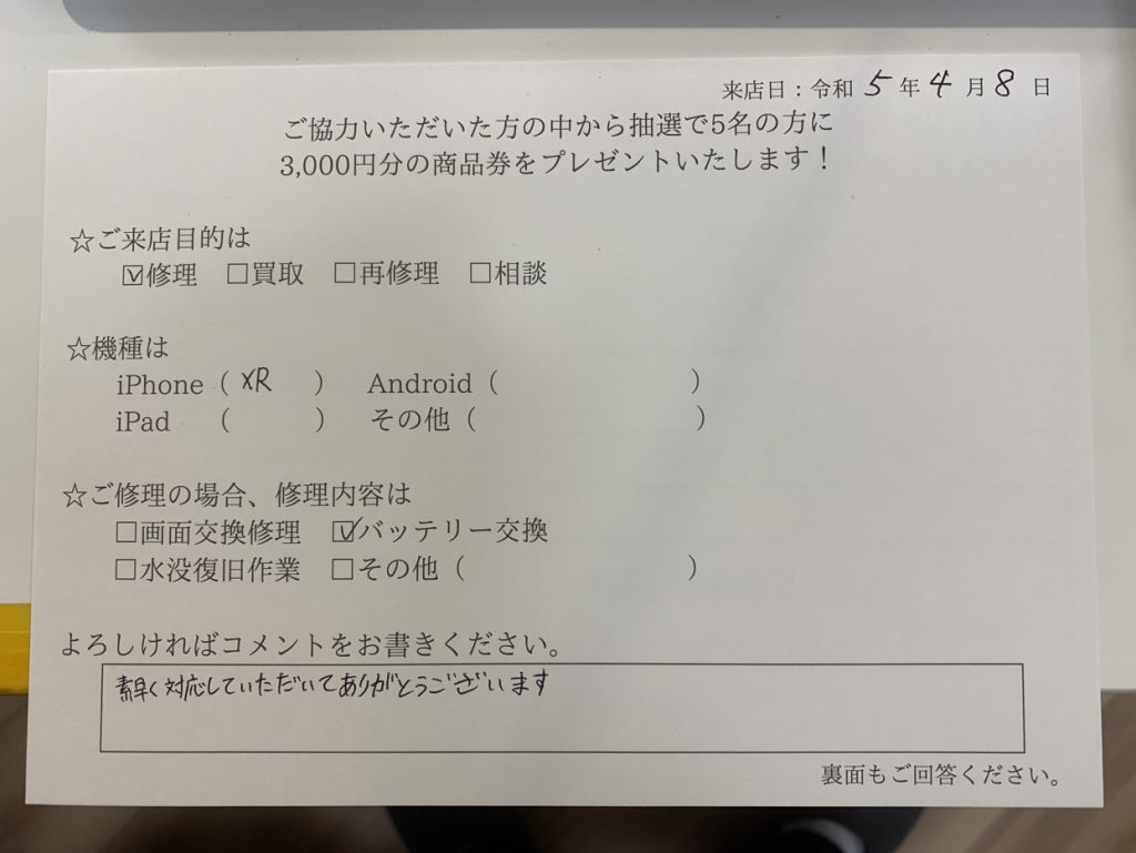 スマホスピタル厚木ガーデンシティ iPhoneXR バッテリー交換修理を行いました。