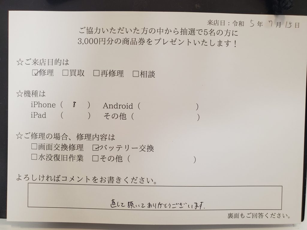 スマホスピタル厚木ガーデンシティ iPhone8バッテリー交換を行いました