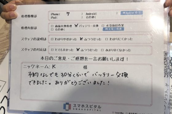 【iPhone7】バッテリー劣化による交換修理 『K様』よりのコメントを頂きました。
