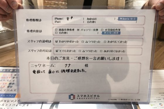 【iPhone 8Plus】バッテリー劣化による交換修理 『ナナ様』よりのコメントを頂きました。