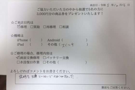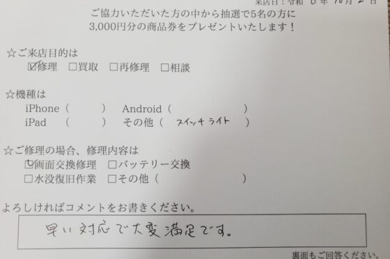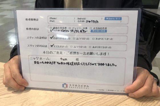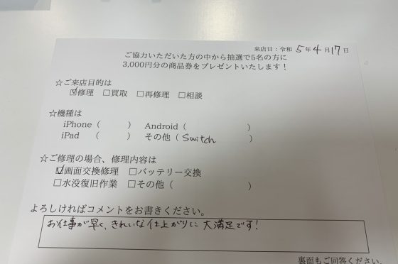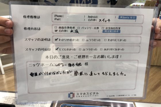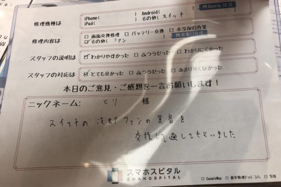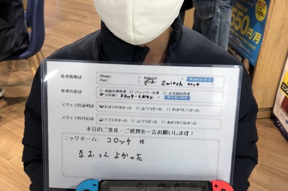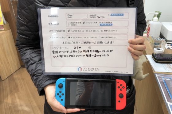 【Switch】バッテリー交換修理 『みちゃ様』よりのコメントを頂きました。