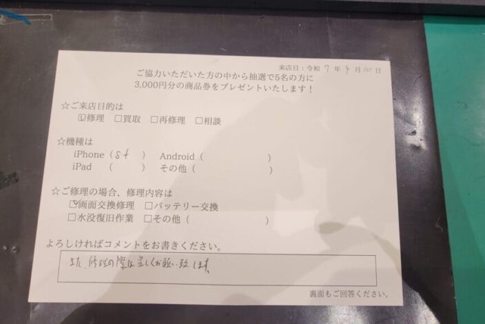 ご本人名義以外のiPhoneでも修理可能です。修理の際にiPhoneの動作確認を行いますので、事前にパスコード(ロック解除の暗証番号)をご確認ください。