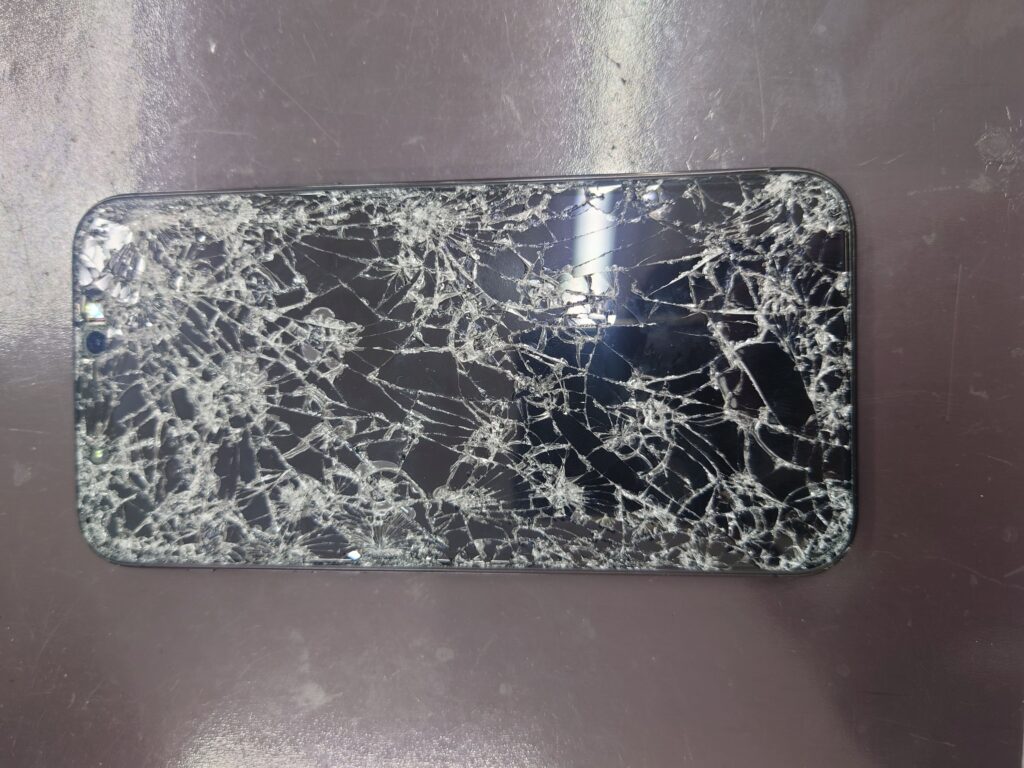 お客様によると、自転車のスマホホルダーから端末が落として車に轢かれて、画面も背面バキバキになっています。
