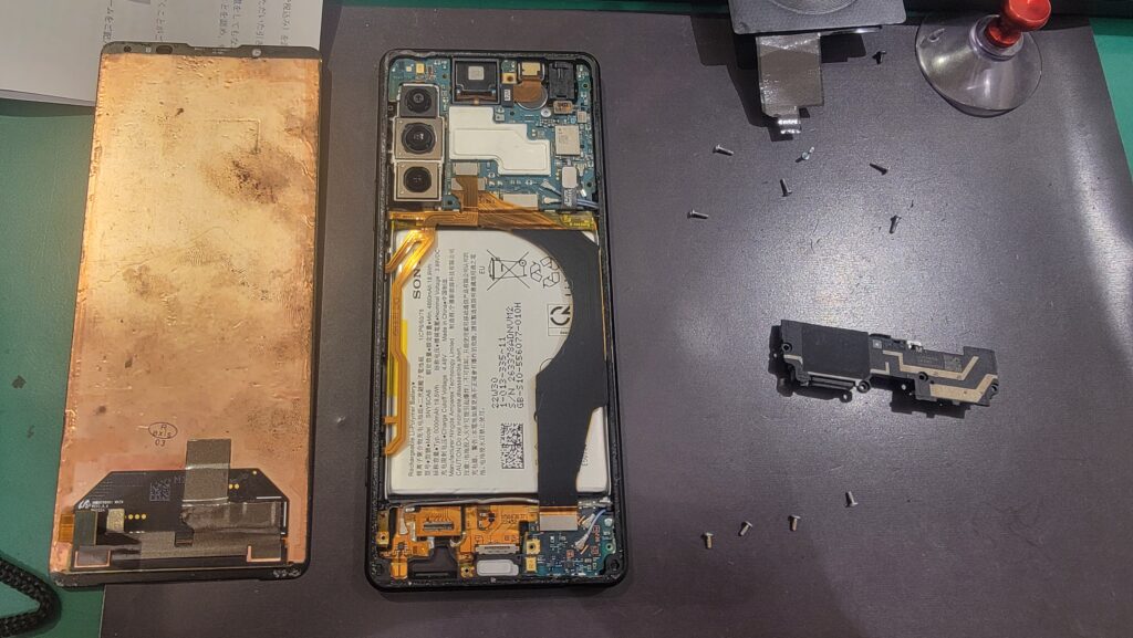修理の際は、端末を分解して破損したディスプレイを丁寧に取り外します。さらに、内部のケーブルやコネクタ部分を確認し、新しい画面を取り付けます。