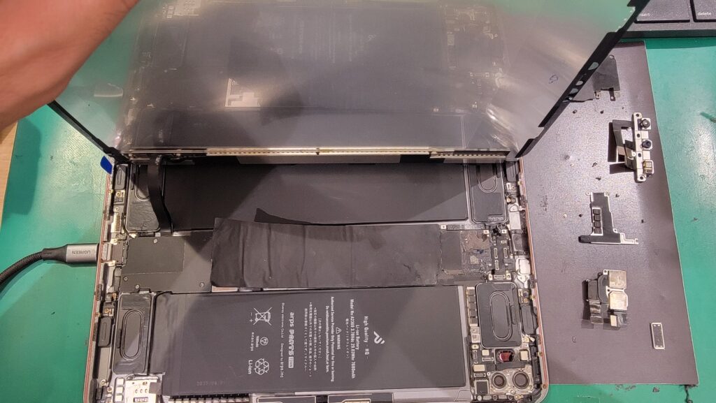 iPad Pro の液晶はタッチセンサーと一体型で、少しの水分でも誤作動が起きやすいため、今回は 画面交換も同時に実施しています。
