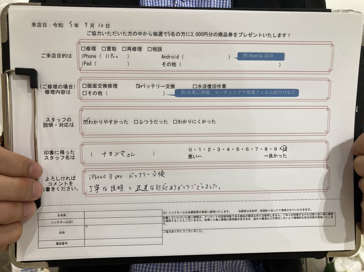 iPhone11Proバッテリー交換 丁寧な説明と迅速な対応ありがとうございました。 (コメントより抜粋)