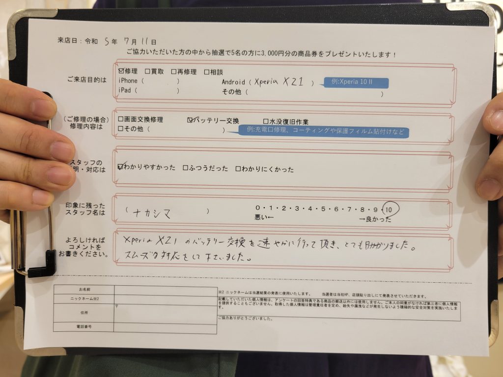 スマホスピタル 大阪駅前店 【お客様の声】XperiaXZ1のバッテリー交換させていただきました。