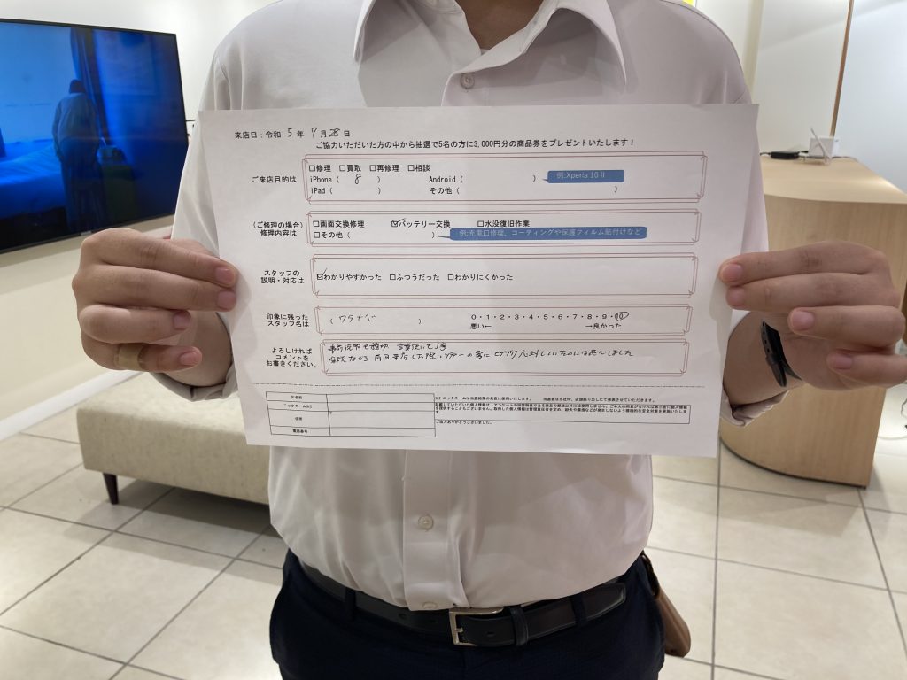 スマホスピタル 大阪駅前店 【お客様の声】iPhone8のバッテリーを交換させていただきました!