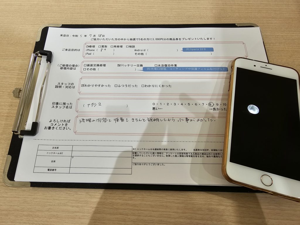 スマホスピタル 大阪駅前店 【お客様の声】iPhone8Plusのバッテリーを交換させていただきました!