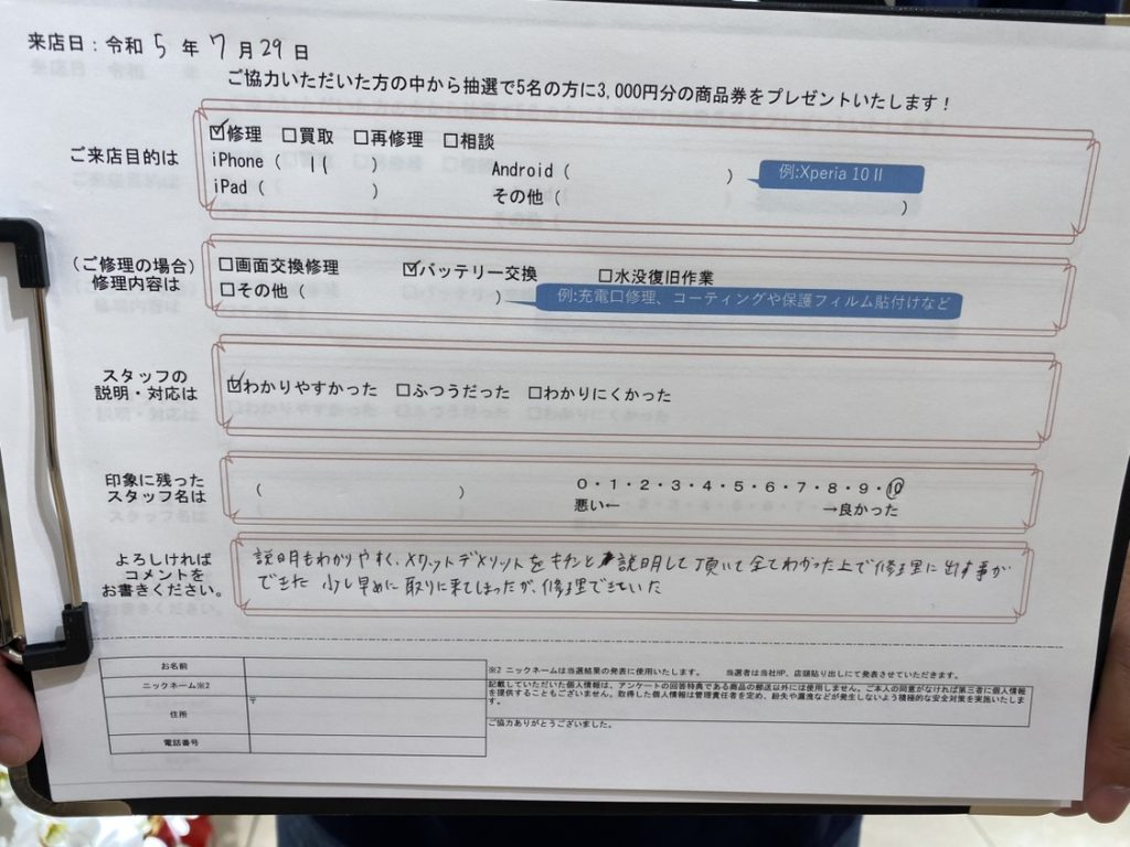 スマホスピタル 大阪駅前店 【お客様の声】iPhone11のバッテリー交換をさせていただきました!