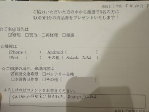 スマホスピタル 大阪駅前店 【お客様の声】Nintendo Switch 液晶画面を交換させていただきました!