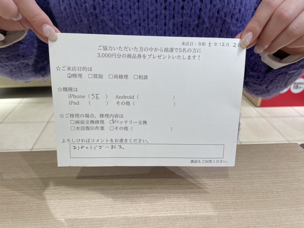 スマホスピタル 大阪駅前店 【お客様の声】大阪市よりお越しのお客様iPhoneSEのバッテリー交換修理をさせていただきました。