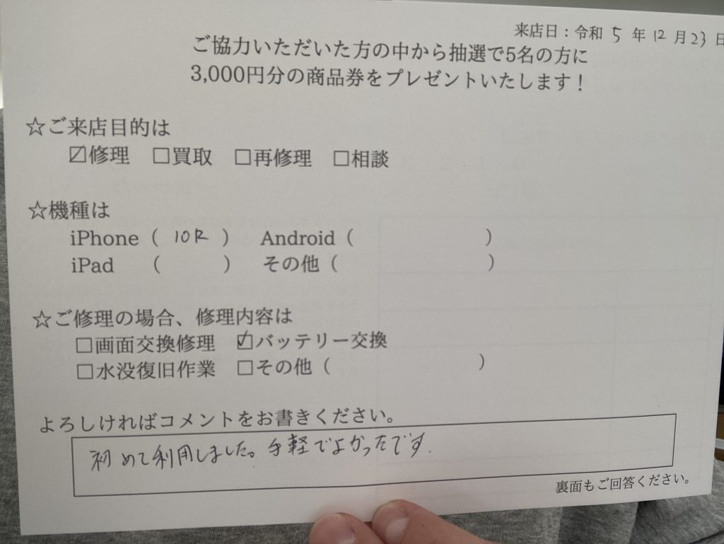スマホスピタル 大阪駅前店 【お客様の声】大阪市よりお越しのお客様iPhoneXRバッテリー交換修理をさせていただきました。