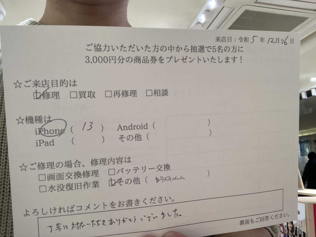 スマホスピタル 大阪駅前店 【お客様の声】大阪市よりお越しのお客様iPhone13画面の保護フィルム貼らせていただきました。