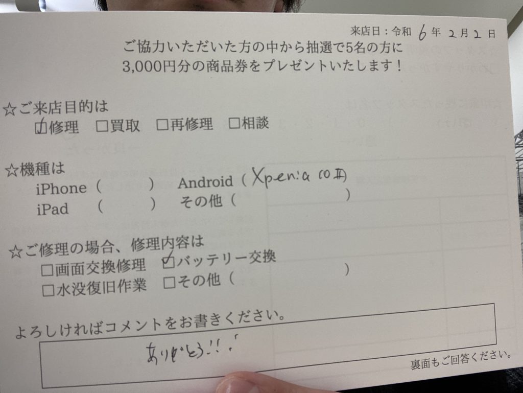 スマホスピタル 大阪駅前店 【お客様の声】大阪市よりお越しのお客様Xperia10Ⅱバッテリー交換修理をさせていただきました。
