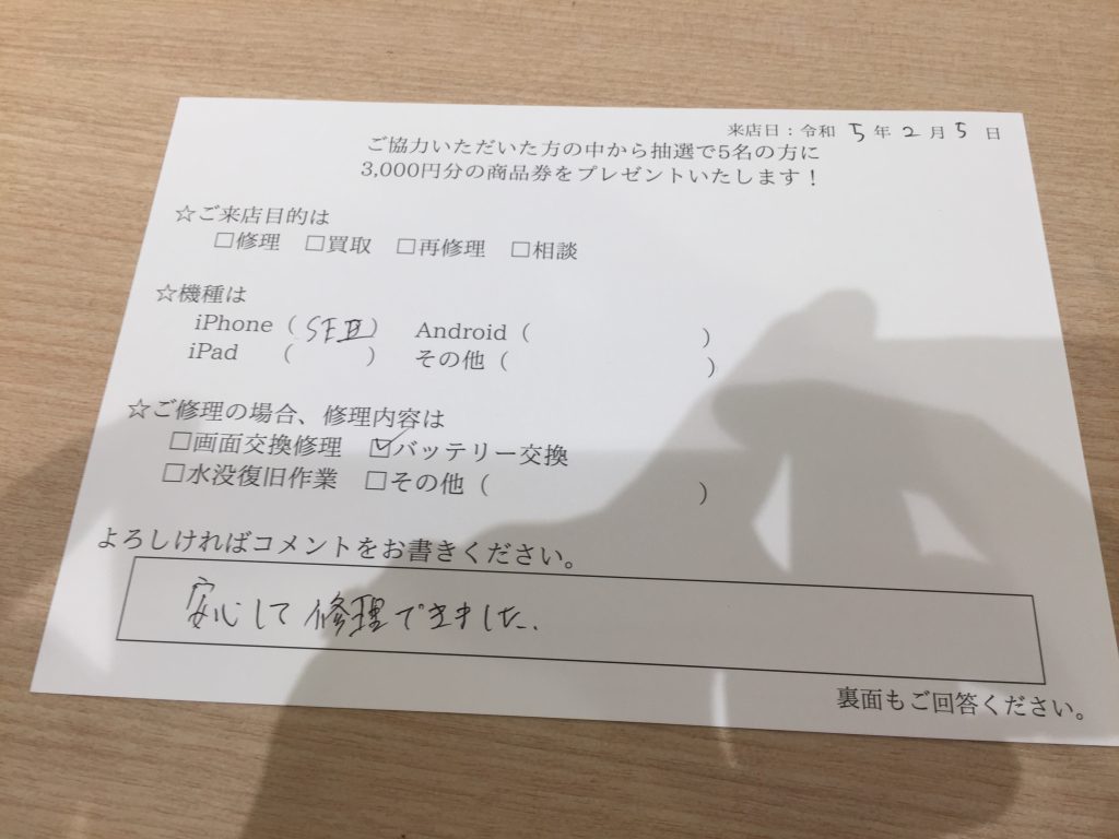 スマホスピタル 大阪駅前店 【お客様の声】大阪市よりお越しのお客様iPhoneSE2バッテリー交換しました。