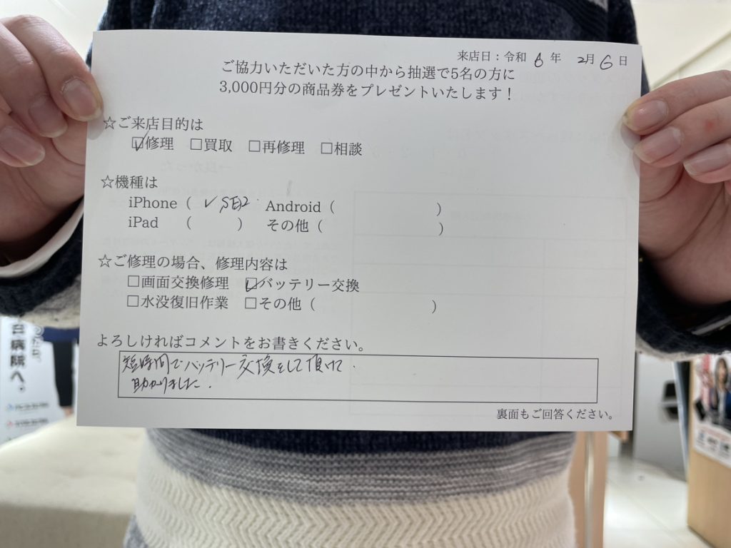 スマホスピタル 大阪駅前店 【お客様の声】大阪市よりお越しのお客様iPhoneSE2バッテリー交換しました。