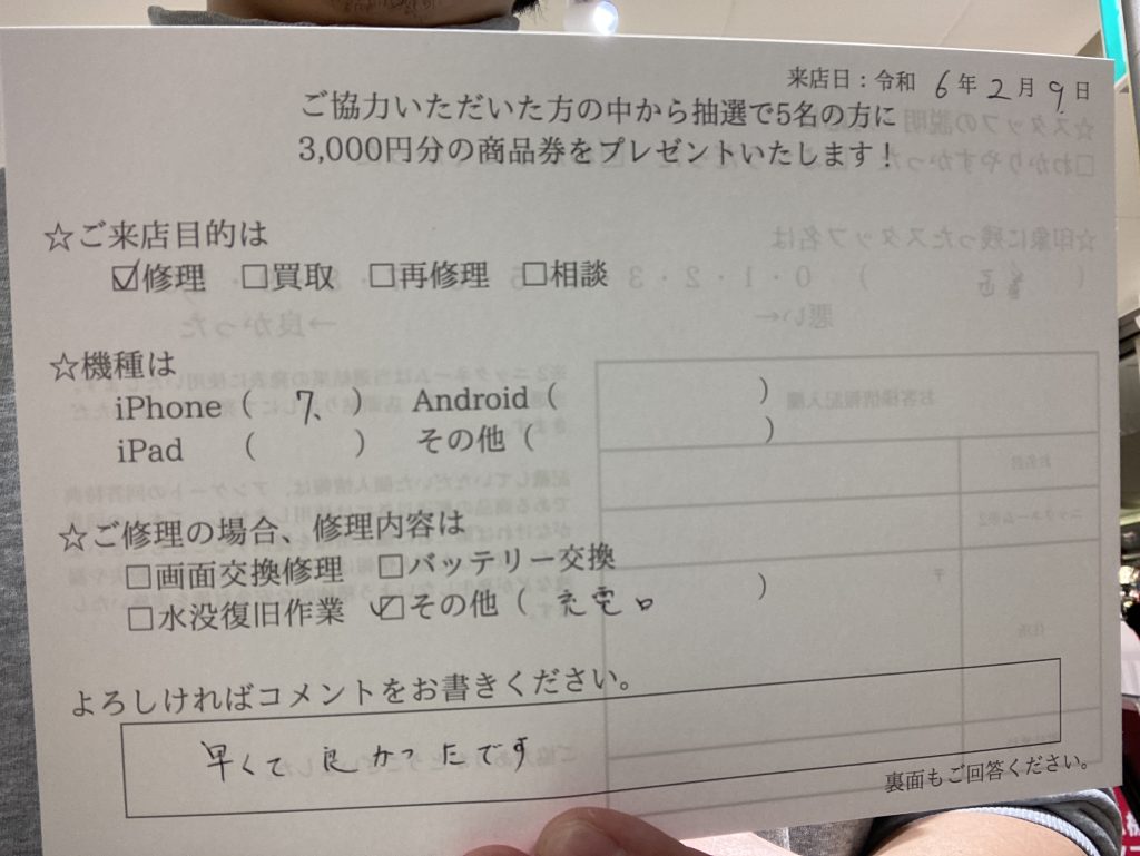 スマホスピタル 大阪駅前店 【お客様の声】大阪市よりお越しのお客様iPhone7充電口交換修理をさせていただきました!