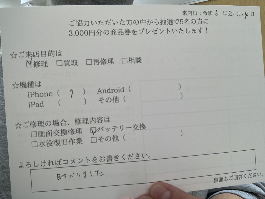 スマホスピタル 大阪駅前店 【お客様の声】大阪市よりお越しのお客様iPhone7バッテリー交換修理させていただきました!