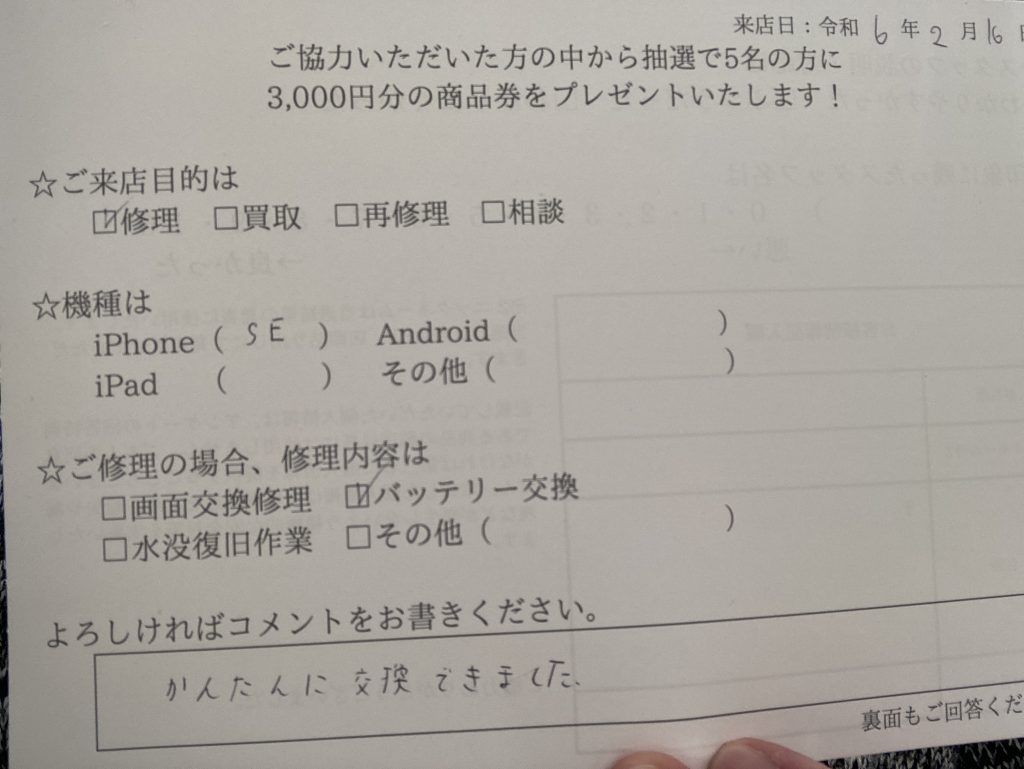 スマホスピタル 大阪駅前店 【お客様の声】大阪市よりお越しのお客様iPhoneSEバッテリー交換修理をさせていただきました。