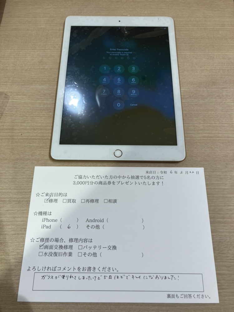 スマホスピタル 大阪駅前店 【お客様の声】尼崎市よりお越しのお客様のiPad6のガラス交換修理をしました!