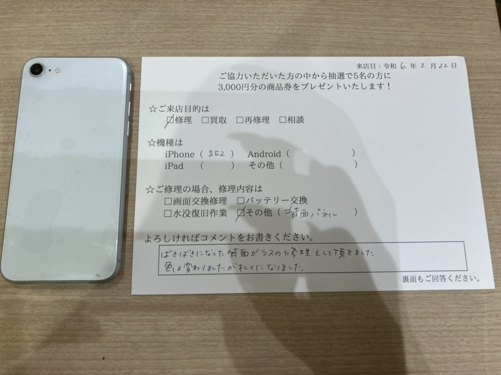 スマホスピタル 大阪駅前店 【お客様の声】大阪市よりお越しのお客様のiPhoneSE2の背面パネル交換修理をしました!
