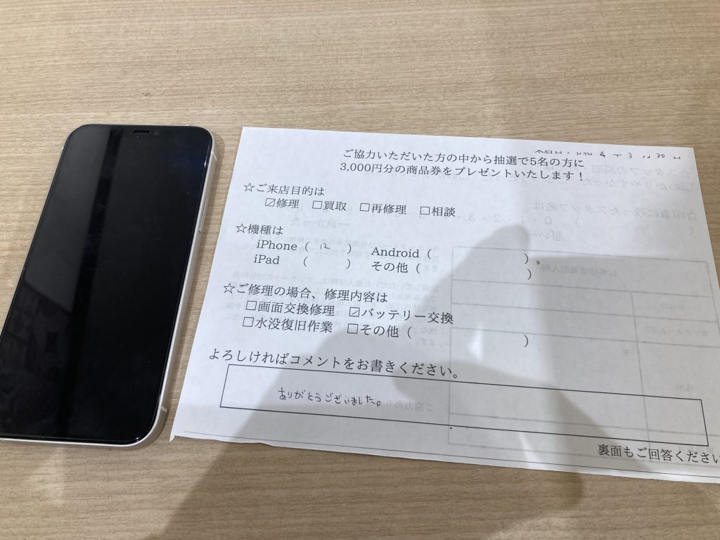 スマホスピタル 大阪駅前店 【お客様の声】大阪市よりお越しのお客様iPhone12バッテリー交換修理させていただきました。
