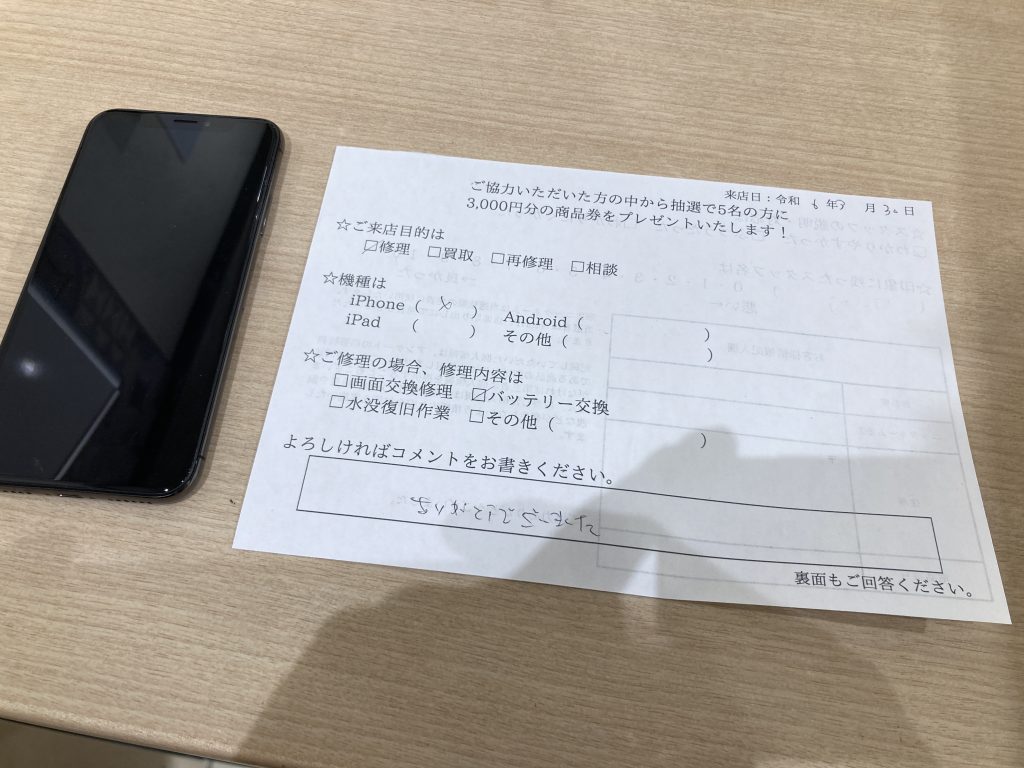スマホスピタル 大阪駅前店 【お客様の声】大阪市よりお越しのお客様iPhoneXバッテリー交換修理させていただきました。