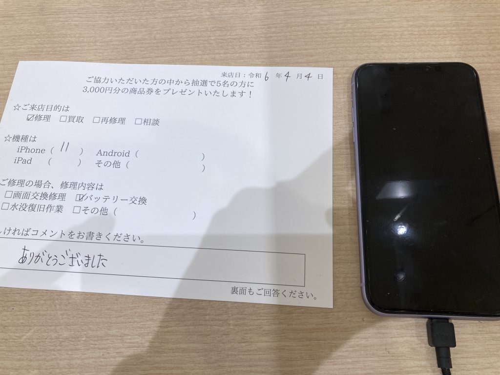 スマホスピタル 大阪駅前店 【お客様の声】大阪市よりお越しのお客様iPhone11バッテリー交換修理させていただきました。