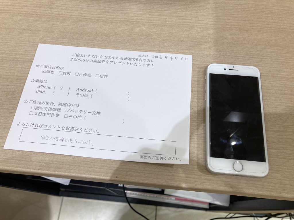 スマホスピタル 大阪駅前店 【お客様の声】大阪市よりお越しのお客様iPhone8バッテリー交換修理させていただきました。