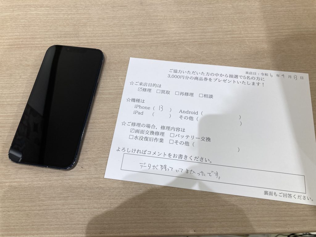 スマホスピタル 大阪駅前店 【お客様の声】大阪市よりお越しのお客様iPhone13画面交換修理させていただきました。
