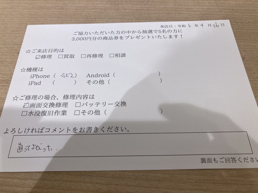 スマホスピタル 大阪駅前店 【お客様の声】大阪市よりお越しのお客様iPhoneSE2画面交換修理させていただきました。