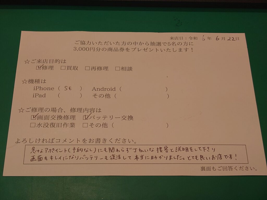 スマホスピタル 大阪駅前店 【お客様の声】iPhoneSE2の画面とバッテリーの交換修理を行いました!