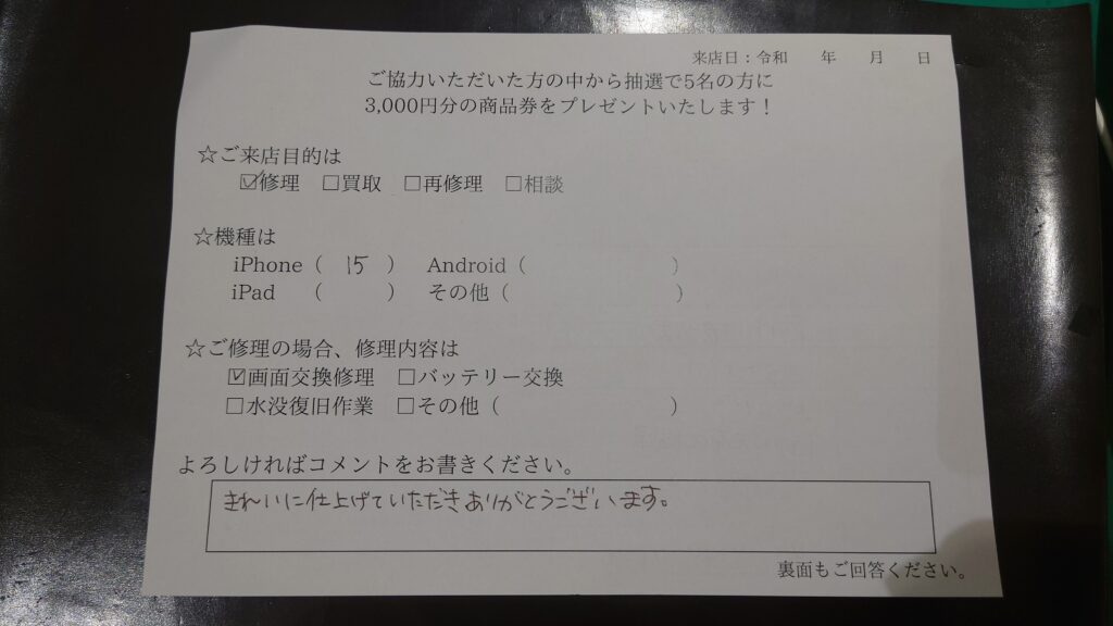 スマホスピタル 大阪駅前店 【お客様の声】iPhone15の画面交換修理を行いました!