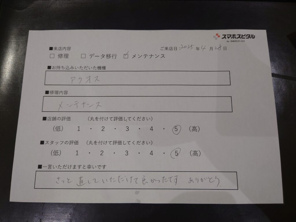 スマホスピタル 大阪駅前店 【お客様の声】SHARP AQUOS端末のメンテナンスを行いました!