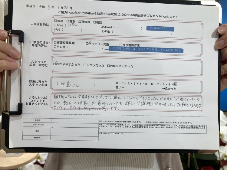 スマホスピタル 大阪駅前店 【お客様の声】iPhone11Proのバッテリー交換をさせていただきました。