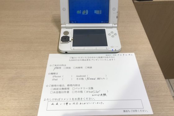 【お客様の声】大阪市のお客様の3DS LLのスライドパッド交換修理をしました!