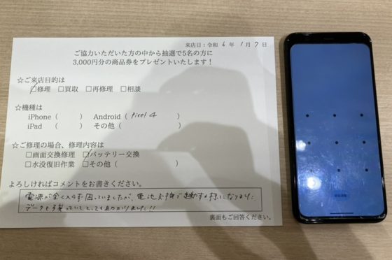【お客様の声】大阪市北区よりお越しのお客様のGooglePixel4のバッテリー交換修理をしました!