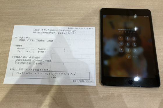 【お客様の声】大阪市よりお越しのお客様のiPadmini5の画面交換修理をしました!