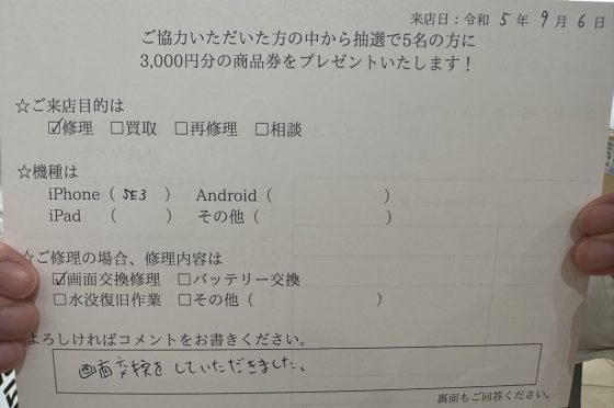 【お客様の声】iPhone SE3 画面交換修理をさせていただきました!