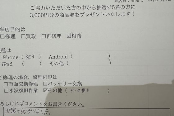 【お客様の声】iPhone SE3 データの復元作業をさせて頂きました!