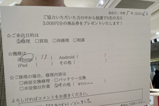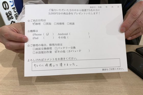 【お客様の声】伊丹市よりお越しのお客様のiPhone13のカメラレンズ交換を行いました!