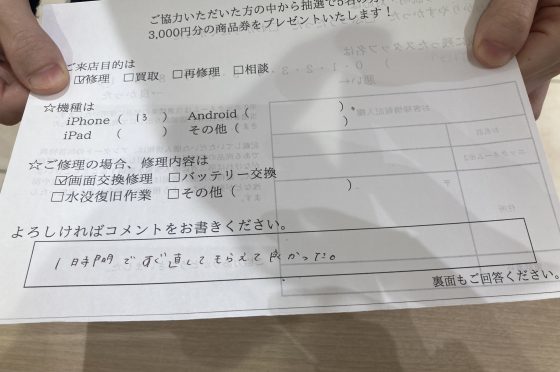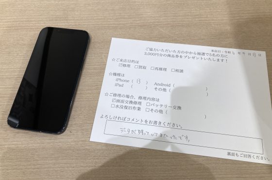 【お客様の声】大阪市よりお越しのお客様iPhone13画面交換修理をさせていただきました。