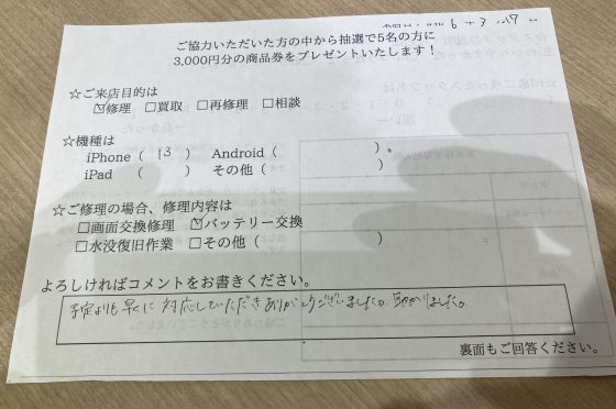 【お客様の声】大阪市よりお越しのお客様iPhone13バッテリー交換修理させていただきました。